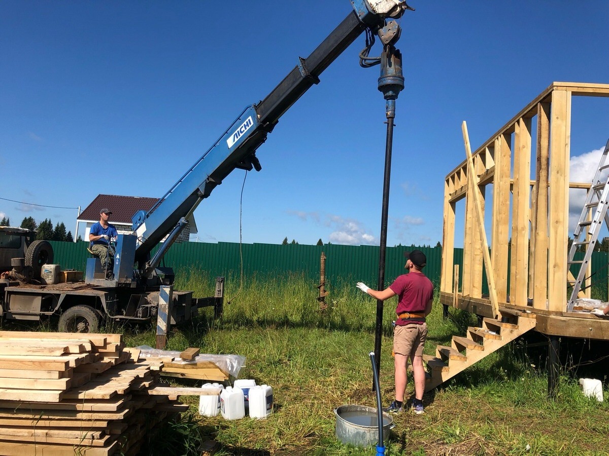 Монтаж фундамента на сваях занимает 1-2 дня. После установки основания не нужно ждать затвердевания и усадки, как в случае с бетонным фундаментом.